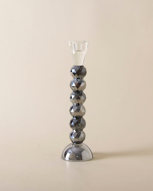 A sophisticated candle stand featuring a series of faceted crystal gleaming sphere stacked along a sleek silver base. The top is designed to hold a taper candle, adding elegance and sparkle to any table setting. Ideal for formal dinners, festive occasions, or as a decorative centerpiece in modern interiors.