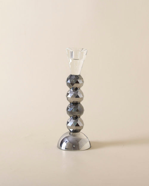 A sophisticated candle stand featuring a series of faceted crystal gleaming sphere stacked along a sleek silver base. The top is designed to hold a taper candle, adding elegance and sparkle to any table setting. Ideal for formal dinners, festive occasions, or as a decorative centerpiece in modern interiors.