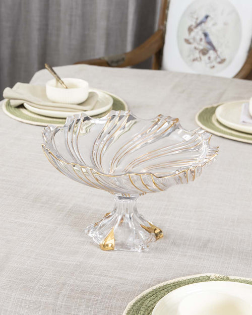 Enhance your kitchen and table decor with our Gold Crystal Footed Platter. Crafted from high-quality crystal glass, this platter features a beautiful golden contrast that will add an elegant touch to any setting. Perfect for serving and displaying your favorite dishes.