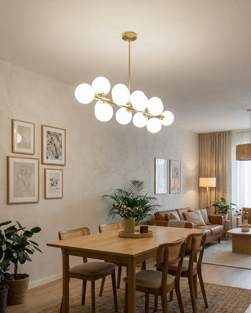 The Liner Globe Bar Chandelier features a straight gold bar fitted with multiple round glass globes that spread soft, even light across the space. Its clean linear design is perfect for dining tables and kitchen islands, adding a modern, stylish look that fits well in contemporary interiors.