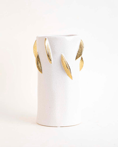 The vase is a cylindrical decorative piece with a textured white exterior. It features gold leaf-like embellishments evenly spaced along its upper half, creating a striking contrast between the white and gold elements. The design gives off a modern, yet earthy vibe, blending minimalism with a touch of luxury.
