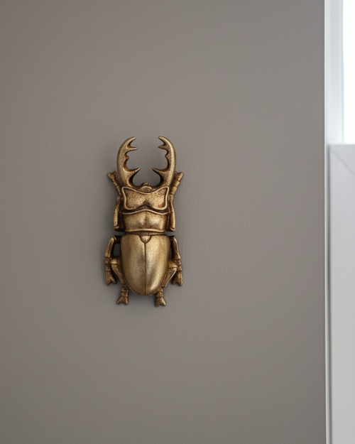 A striking wall accent featuring a gold-finished beetle design, symbolizing strength and transformation. Its detailed body and sculpted texture bring an artistic, nature-inspired charm to any space. Perfect for adding a touch of elegance and curiosity to modern or eclectic interiors.