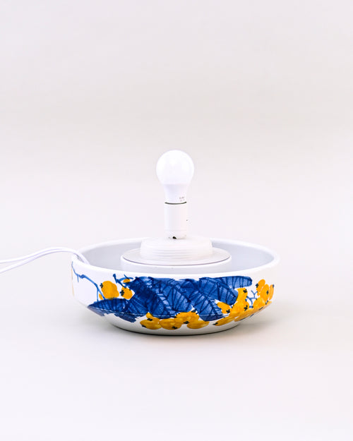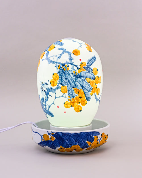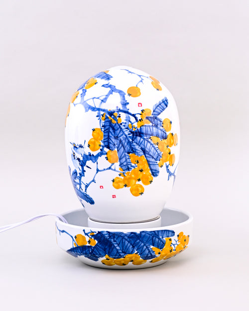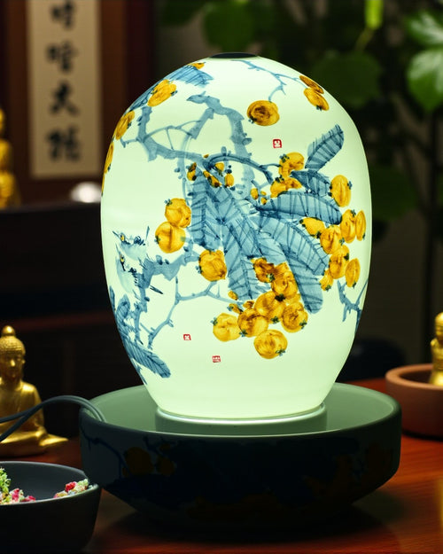 The Golden Blossom Serenity Ceramic Fountain Lamp features a stunning hand-painted design of vibrant yellow blossoms and delicate blue branches with perched birds, symbolizing harmony and new beginnings. Crafted from premium ceramic, it produces a gentle water flow, creating a calming and soothing ambiance.