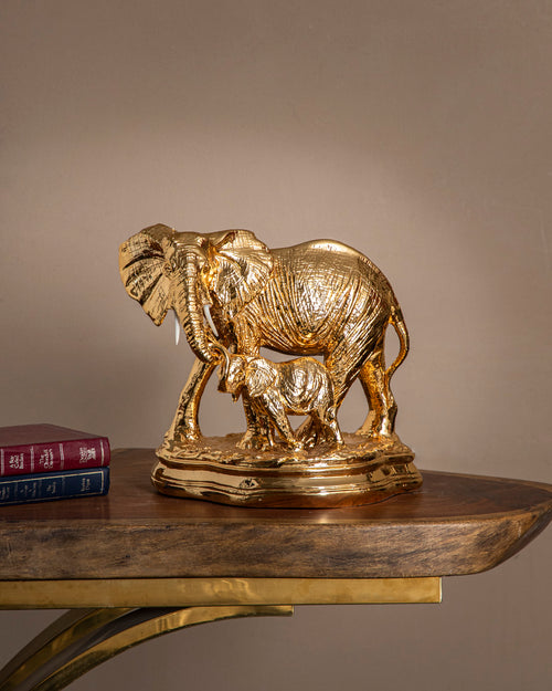 This elegant sculpture features a majestic elephant and its calf, captured in a tender and protective moment. Cast in a brilliant gold finish, the piece radiates warmth, strength, and familial love. The mother elephant's gentle posture and the calf’s close stance evoke deep emotional resonance and symbolize nurturing, wisdom, and loyalty. Resting on a polished base, the sculpture makes a powerful yet graceful addition to any home or office decor.