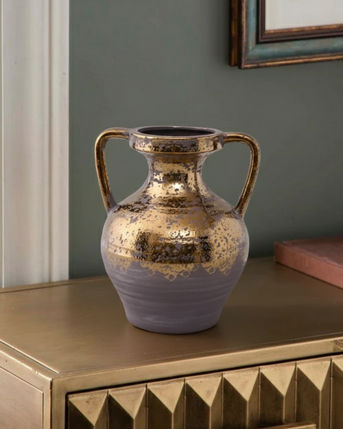 Bring timeless elegance to your interiors with the Golden Heritage Dual Handle Vase. Inspired by classic Mediterranean pottery, this vase features a beautiful fusion of antique gold glaze and matte grey base. The dual-handle design adds a touch of vintage charm, while the textured metallic finish enhances its luxurious appeal. Perfect for center tables, consoles, or statement décor corners.