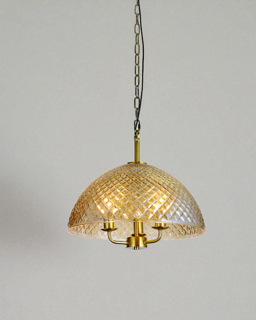 The Golden Lattice Dome Pendant Light features a beautifully textured dome-shaped glass shade with a golden lattice pattern. Supported by a sleek brass-finish frame and chain, it casts a warm, radiant glow that adds a touch of vintage charm and elegance to dining rooms, living areas, or hallways.