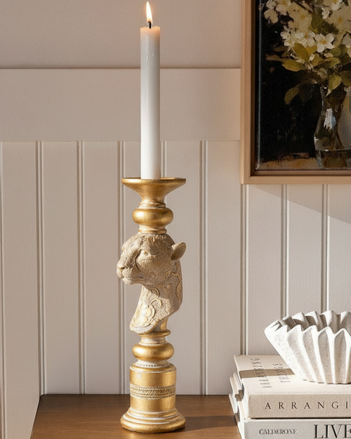 Finished in a radiant antique gold tone, it brings warmth and sophistication to any space — perfect for enhancing tabletops, mantels, or festive décor. A true statement of elegance, the Golden Leopard Candle Stand adds a touch of nature-inspired opulence to your home.