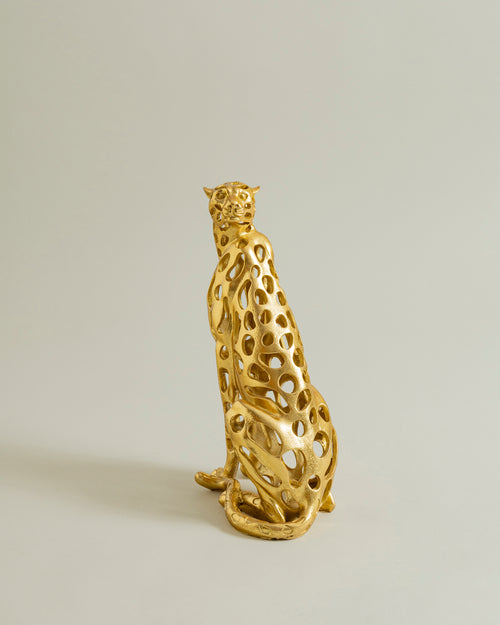 This is a beautiful decorative figurine that has a modern look with a leopard design that is quite unique with an openwork pattern and a golden finish. It is quite bold and regal in appearance, making it a great addition to your home decor. It is quite elegant and sophisticated with a sense of power.
