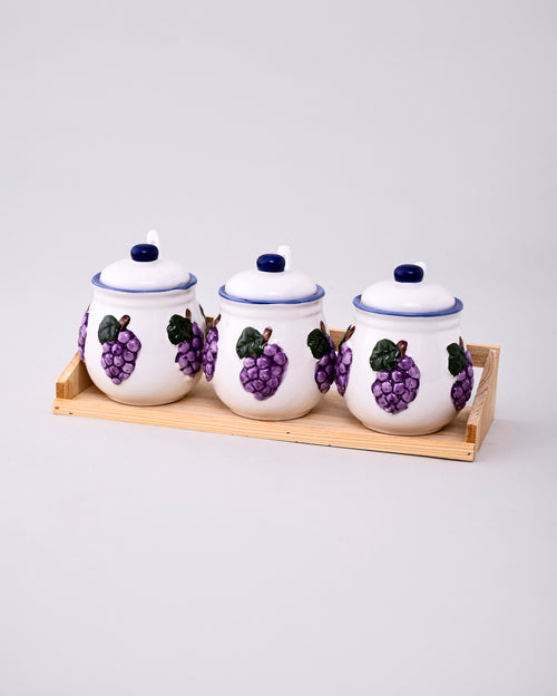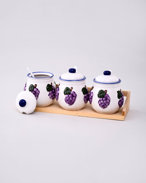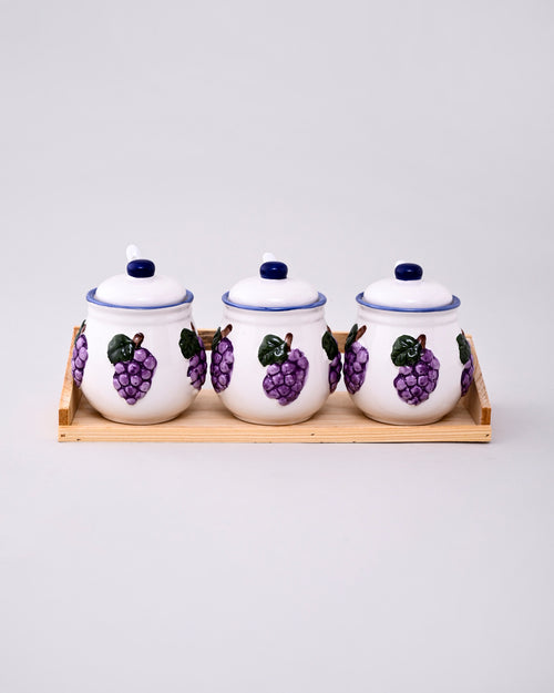 This Graceful Grapes Condiment Server With Spoon is a charming addition to any kitchen. Made with high-quality ceramic, it features design and comes with a matching spoon. Perfect for storing and serving your favourite condiments or spices with a touch of country charm.