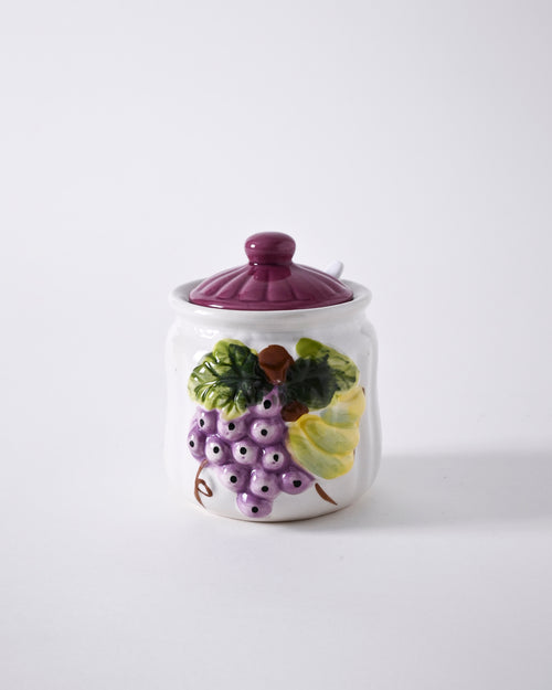 This Graceful Grapes Condiment Server With Spoon is a charming addition to any kitchen. Made with high-quality ceramic, it features design and comes with a matching spoon. Perfect for storing and serving your favourite condiments or spices with a touch of country charm.