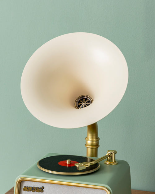 A decorative Bluetooth speaker that takes inspiration from the gramophone, designed to add a touch of vintage flair to the modern home through wireless music streaming. Ideal for use as a decorative item in living rooms, shelves, or office desks.