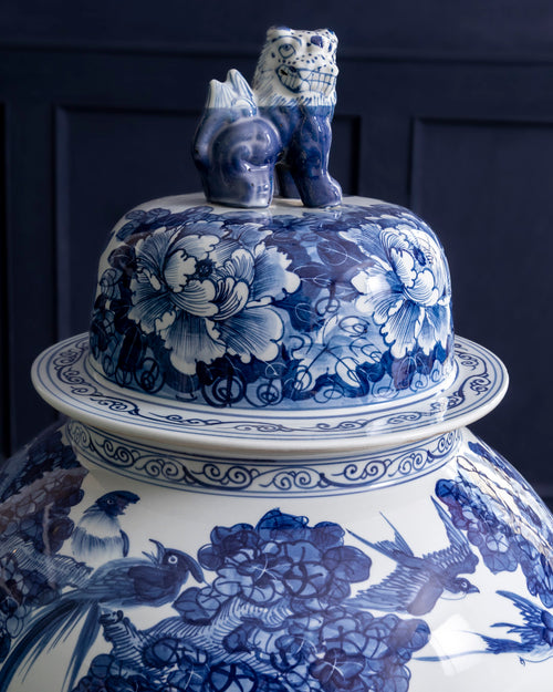 The rich blue artwork flows gracefully across the soft white base, highlighting intricate patterns and traditional artistry. Finished with a sculpted guardian lid, this oversized jar brings a sense of heritage and sophistication to any space.