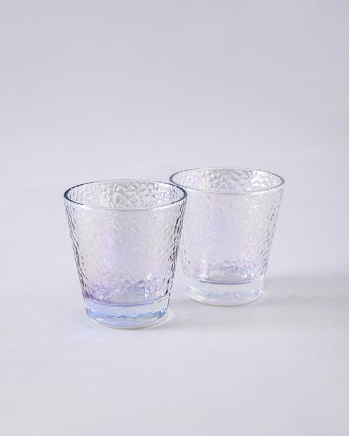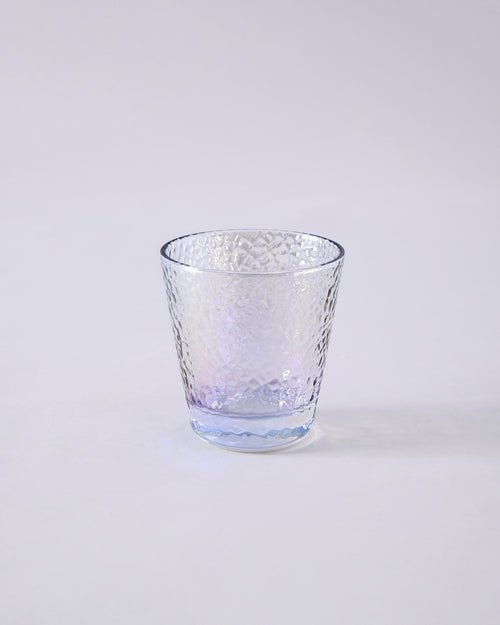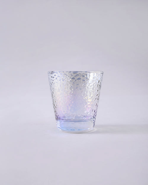 A chic and compact glass featuring a hammered texture and mesmerizing iridescent finish that reflects subtle hues under light. Its rounded silhouette and comfortable grip make it perfect for serving whiskey, juice, or cocktails. A beautiful blend of modern elegance and timeless craftsmanship, ideal for everyday use or stylish entertaining.
