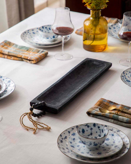 Elevate your kitchen and table decor with our meticulously handcrafted Hanlin Wooden Tray. Its sophisticated black color complements any setting, while its lightweight design makes it easy to carry and serve with ease.