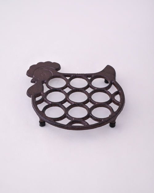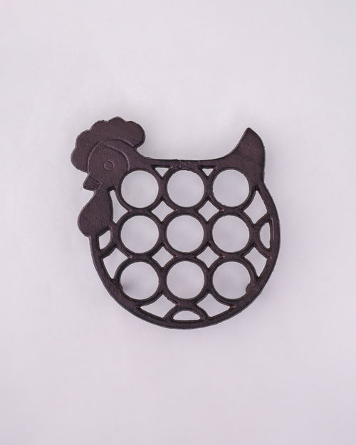 A charming cast iron egg holder designed in the shape of a hen, featuring a rustic finish and sturdy build. The open circular pattern provides perfect slots for storing eggs while adding a touch of farmhouse elegance to your kitchen décor. Durable, decorative, and delightfully functional.