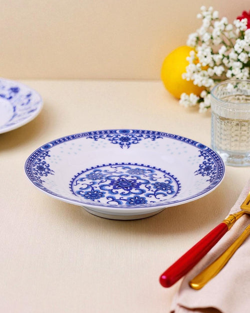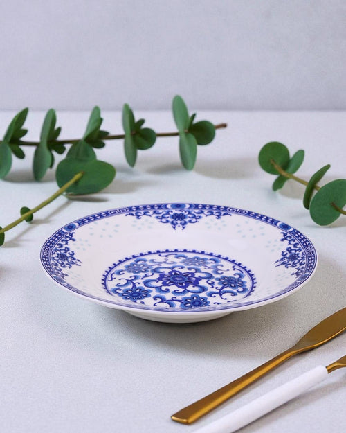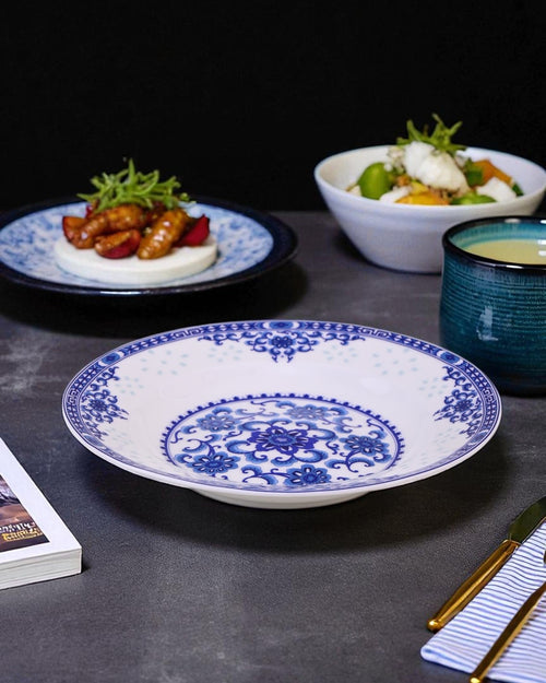 Inspired by classic blue pottery designs, this hand-painted bone china plate is both functional and stylish. Ideal for family dinners or festive gatherings, it elevates your food presentation beautifully.