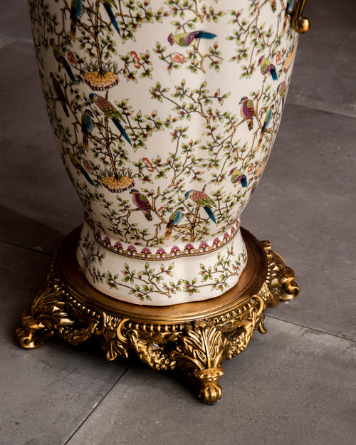 The 'Imperial Aviary' Ornamental Floor Vase is a stunning decorative piece that adds a touch of vintage charm and sophistication to any interior. Crafted from high-quality ceramic, this tall floor vase showcases a classic ivory base adorned with intricate black and gold floral patterns. The vase features an elegant fluted rim and ornate gold-finished handles that enhance its antique appeal. It rests on a beautifully detailed, baroque-style metallic base, which adds grandeur and stability