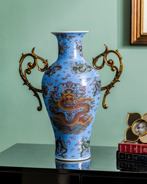Elevate your décor with the striking elegance of the Imperial Blue Dragon Art Vase. Featuring a stunning sky-blue backdrop adorned with intricate dragon motifs, this vase embodies power, protection, and timeless artistry. The ornate antique-gold handles add a regal touch, blending traditional craftsmanship with royal charm. Perfect as a standalone statement piece or paired with floral arrangements, it brings grandeur and cultural richness to any living room, hallway, or display console.