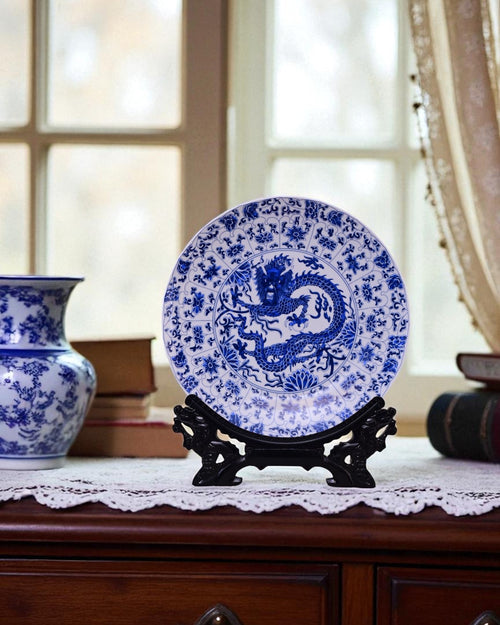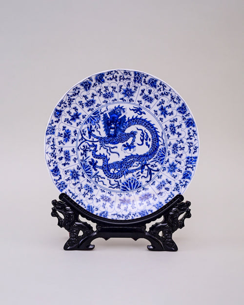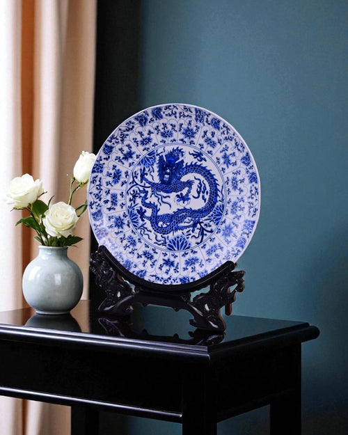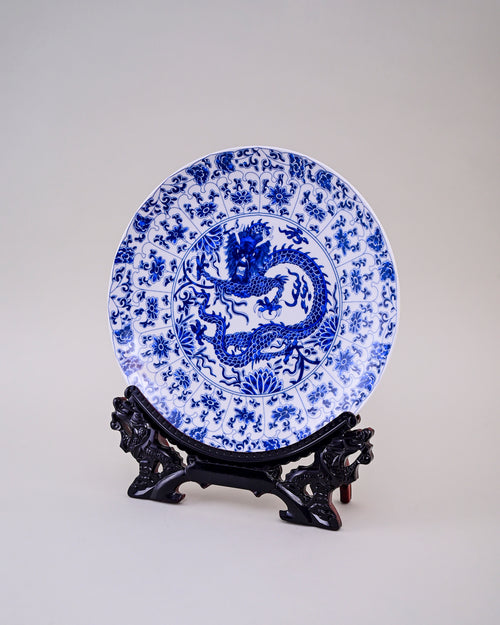 This striking porcelain plate features a majestic blue dragon at its center, surrounded by intricate floral and vine motifs. Symbolizing strength, protection, and prosperity in Chinese tradition, the dragon is meticulously detailed in deep cobalt blue against a white background.