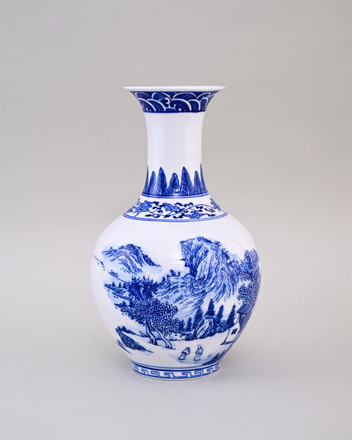 An elegant vase featuring intricate blue landscape artwork inspired by traditional oriental design. The detailed scenery of mountains, trees, and village life beautifully contrasts against the smooth white surface, while the flared neck and rounded body create a classic silhouette. Perfect as a statement décor piece for consoles, shelves, or center tables, it brings timeless artistic charm to any interior.