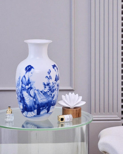 This Blue Blossom Bone China Vase features hand-painted blue floral designs that symbolize grace and freshness. The pure white base with delicate blossoms makes it a timeless decorative piece for any space.