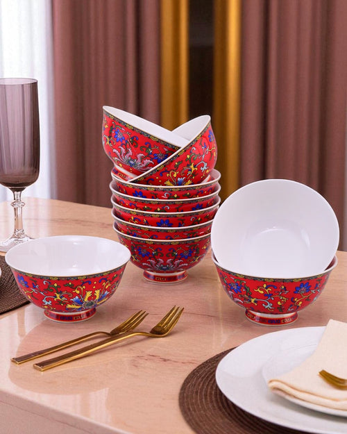 This exquisite katori showcases a vibrant red base adorned with intricate floral and traditional motifs, giving it a regal and artistic charm. Perfect for serving desserts, dry fruits, chutneys, or side dishes, it adds a luxurious touch to your dining table. Its fine craftsmanship and colorful detailing make it an elegant choice for festive occasions, special gatherings, and home décor displays.