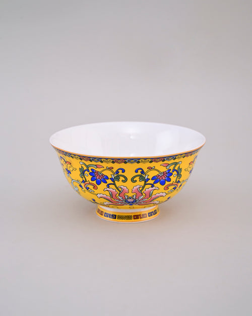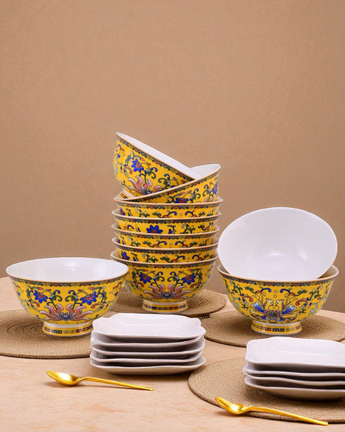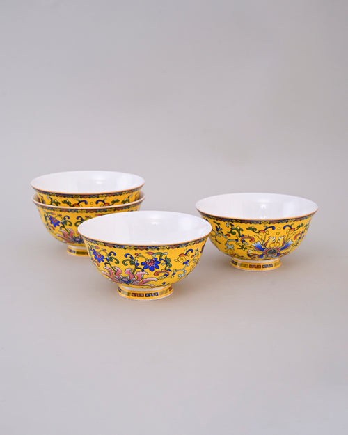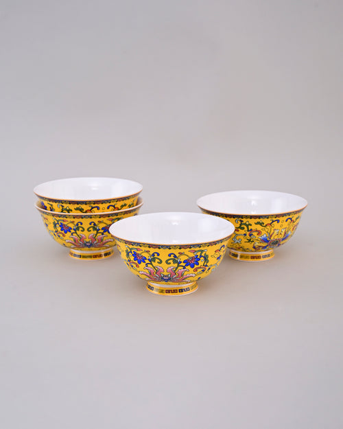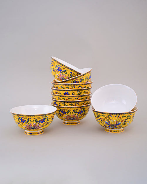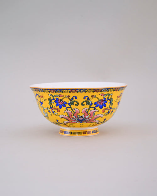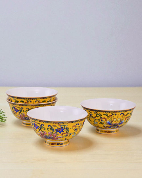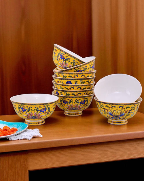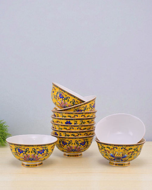 This exquisite katori showcases a vibrant yellow base adorned with intricate floral and traditional motifs, giving it a regal and artistic charm. Perfect for serving desserts, dry fruits, chutneys, or side dishes, it adds a luxurious touch to your dining table. Its fine craftsmanship and colorful detailing make it an elegant choice for festive occasions, special gatherings, and home décor displays.