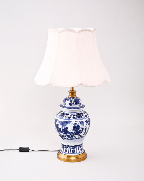 This Imperial Carriage Blue & White Table Lamp is crafted in traditional blue and white porcelain, showcasing a vivid hand-painted warrior scene surrounded by nature motifs. The strong brushwork and detailed imagery reflect themes of bravery, strength, and cultural storytelling.
