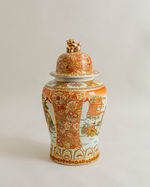 This beautiful temple jar boasts a sleek and curved design, complete with a close-fitting lid and an elaborate finial, to give it a regal and traditional look. The body of the jar is intricately decorated with elaborate hand-painted court scenes, flowers, and architectural motifs in rich shades of red, gold, and pastel colors.