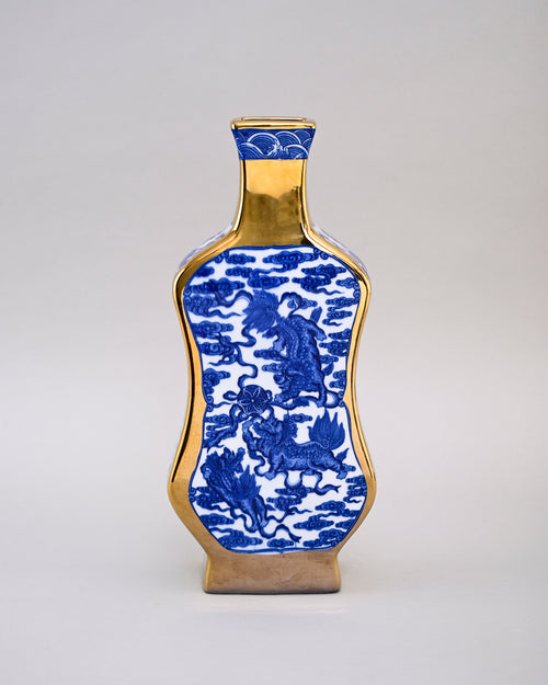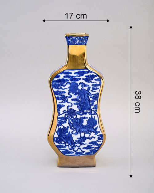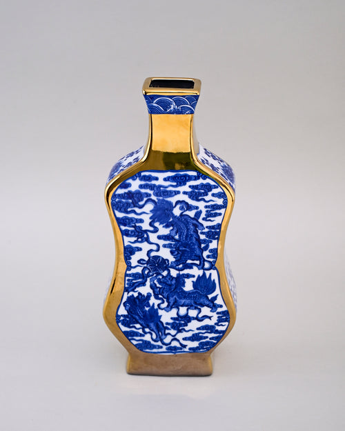 This vase stands out with its distinctive wavy square form, combining golden elegance with traditional cobalt blue artistry. The central panels depict mythical dragons amidst swirling clouds, symbolising strength, prosperity, and divine protection.