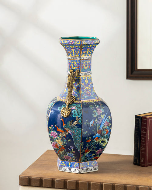 A grand decorative vase featuring intricate floral and bird motifs inspired by traditional cloisonné art. Its bold, multi-panel body design is paired with ornate brass phoenix handles that add regal charm. Perfect as a statement centerpiece in classic or luxury interiors.