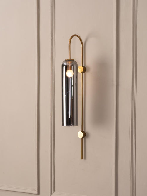 Add a touch of modern sophistication to your home with this single light wall sconce. This wall sconce features a brushed brass finish and a grey glass shade.
