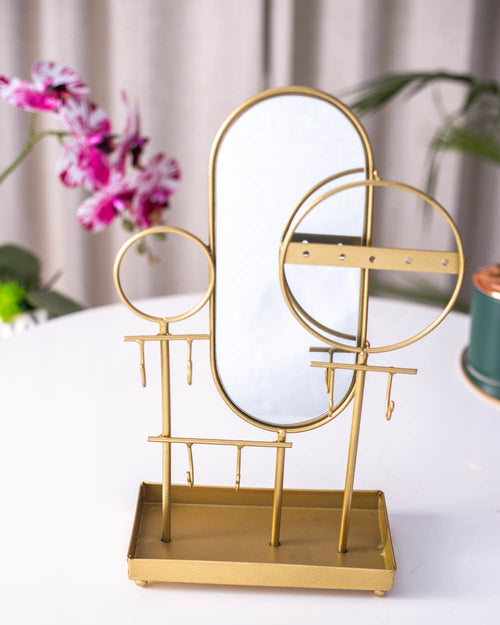 Give your dresser a glam look and stand to organize your jewelry. Made from lightweight metal in a golden-brass finish. Tall and freestanding jewelry holder that features plenty of space for all your bits and accessories. There are three bars for bracelets and shorter necklaces, two lines with holes for hook-on and stud earrings, hooks to hand all kinds of accessories, and a generous trinket tray for rings, makeup, watches, and other beauty products.