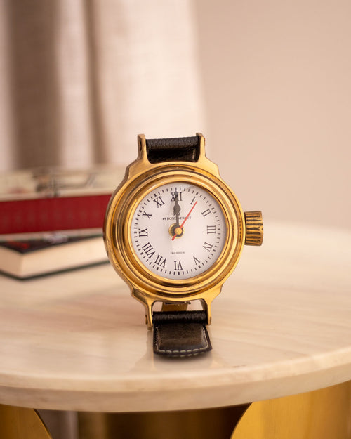 A Quirky Home Decor Accessory For Your Home. Modelled after a wrist watch, these large and small shelf decor accessories are clocks that actually work, with a brass dial along with leather straps, with the bottom strap supporting the motif for stability.