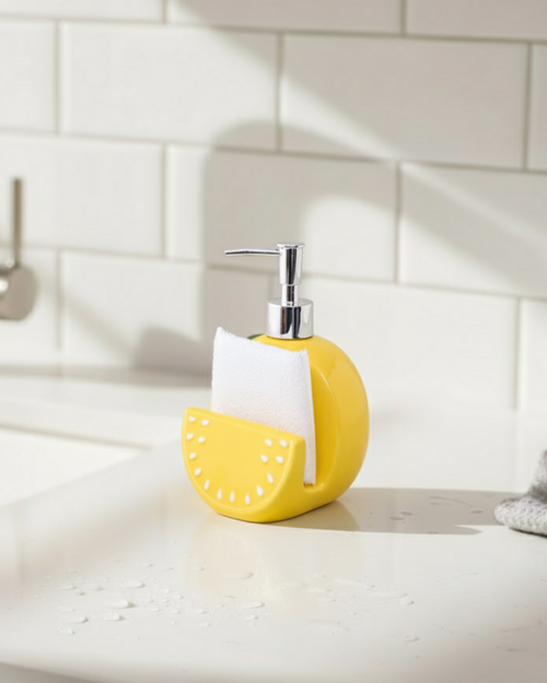 Bring style and sustainability to your daily routine with this Lemon Sope Dispoance With Scrub Holder. Crafted from high-quality, durable material, it’s perfect for refilling with your favorite hand wash, dish soap, or lotion. The sleek design and easy-pump mechanism make it both functional and elegant ideal for modern bathrooms, kitchens, or office washrooms.