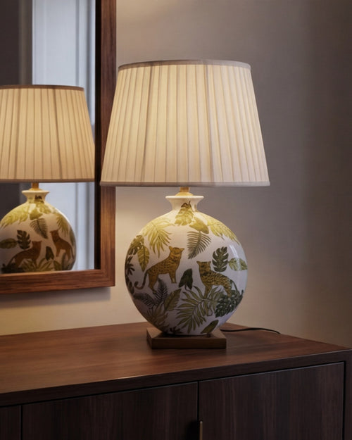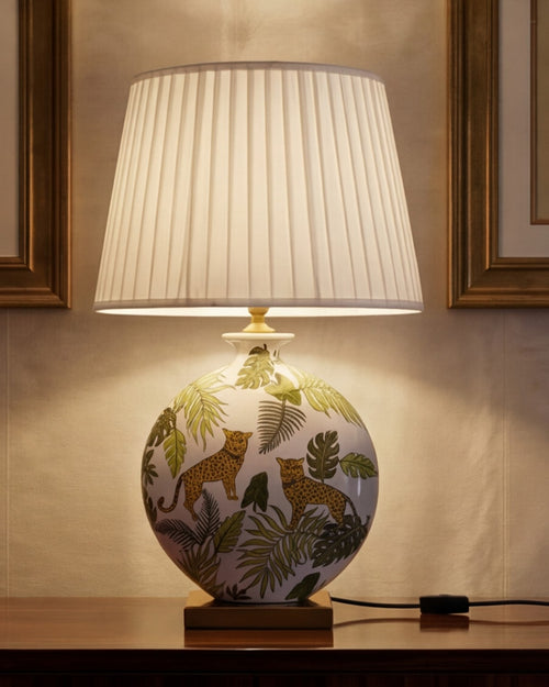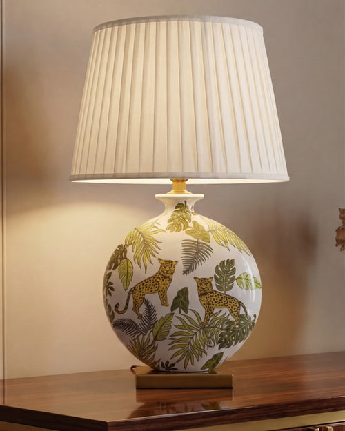 The Leopard Print Ceramic Table Lamp features a round ceramic base with a jungle leaf and leopard design, paired with a soft pleated fabric shade. It gives a warm, cozy glow and works well on bedside tables, side tables, and living room corners, adding a bold decorative touch to modern and classic interiors.