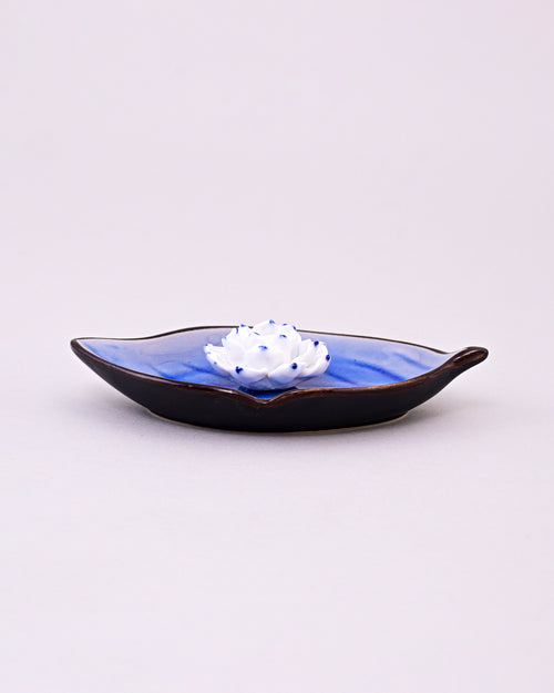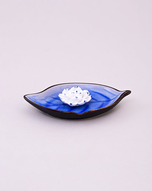 The Lotus Bliss Bodhi Leaf Incense Holder beautifully combines the elegance of a lotus with the serenity of a Bodhi leaf design. Crafted from fine ceramic, it features a delicate leaf-shaped tray with a smooth blue glaze and a charming white lotus at the center.