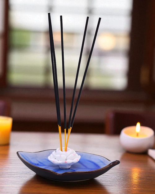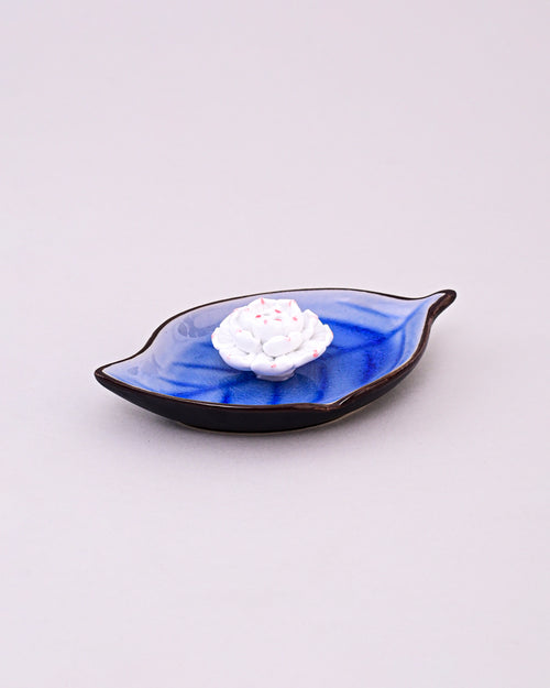 The Lotus Bliss Bodhi Leaf Incense Holder beautifully combines the elegance of a lotus with the serenity of a Bodhi leaf design. Crafted from fine ceramic, it features a delicate leaf-shaped tray with a smooth blue glaze and a charming white lotus at the center.