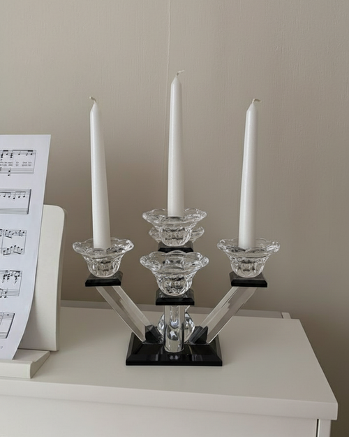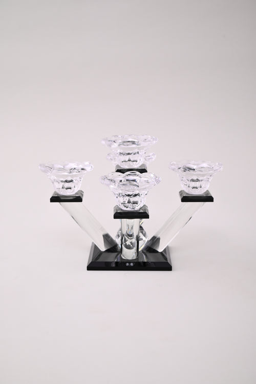 A contemporary 5-holder candle stand designed with clear glass flower-shaped cups resting on sleek angular crystal arms. The geometric black base enhances its modern appeal, while the layered glass design reflects light beautifully for a radiant glow. Ideal for elegant centerpieces or ambient lighting, this piece blends floral charm with architectural sophistication.