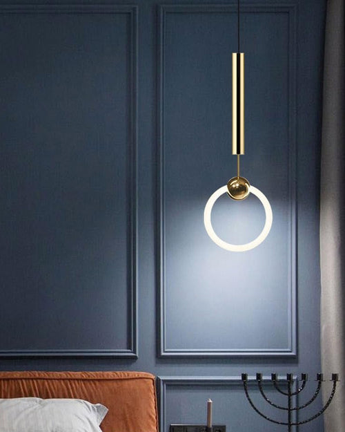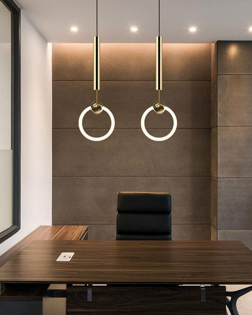 Sleek, stylish, and perfectly balanced—the Lunar Loop Pendant Lights bring a modern sculptural touch to any dining or living space. Featuring two glowing LED rings suspended from slender vertical gold-finished rods, these pendants play with geometry and symmetry to create a striking visual rhythm. The floating circular forms cast a soft, ambient light ideal for contemporary interiors seeking a blend of function and design finesse. Perfect for dining rooms, lounges, or above kitchen islands.