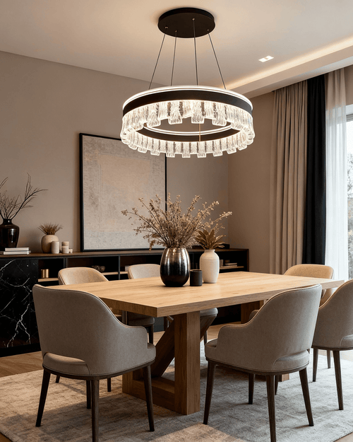 The Lustra Crown Crystal Chandelier commands attention with its bold, circular form and elegant detailing. The outer ring, finished in matte black or dark bronze, houses integrated LED lighting that creates a sleek and ambient glow. What sets this chandelier apart is its cascading crown of hand-textured crystal-like glass pieces, which hang from the inner edge of the ring and mimic the look of icy stalactites or waterfall droplets.