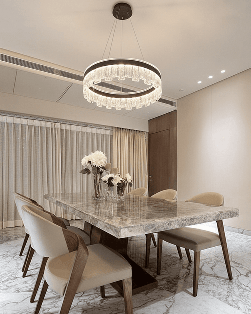 The Lustra Crown Crystal Chandelier commands attention with its bold, circular form and elegant detailing. The outer ring, finished in matte black or dark bronze, houses integrated LED lighting that creates a sleek and ambient glow. What sets this chandelier apart is its cascading crown of hand-textured crystal-like glass pieces, which hang from the inner edge of the ring and mimic the look of icy stalactites or waterfall droplets.