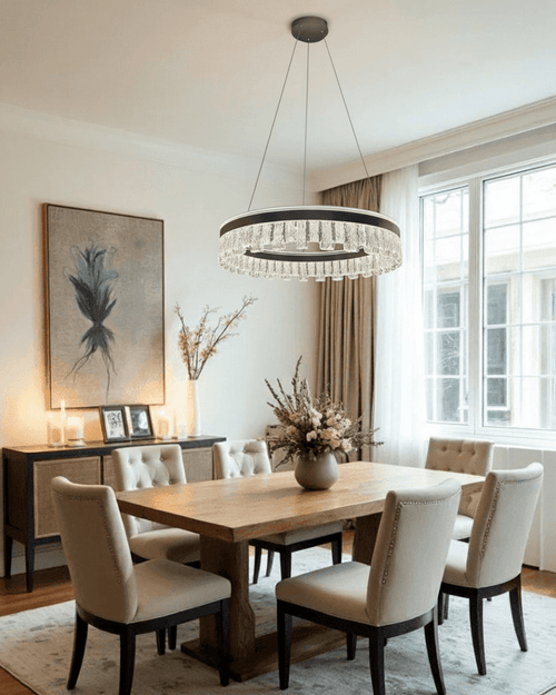 The Lustra Crown Crystal Chandelier commands attention with its bold, circular form and elegant detailing. The outer ring, finished in matte black or dark bronze, houses integrated LED lighting that creates a sleek and ambient glow. What sets this chandelier apart is its cascading crown of hand-textured crystal-like glass pieces, which hang from the inner edge of the ring and mimic the look of icy stalactites or waterfall droplets.