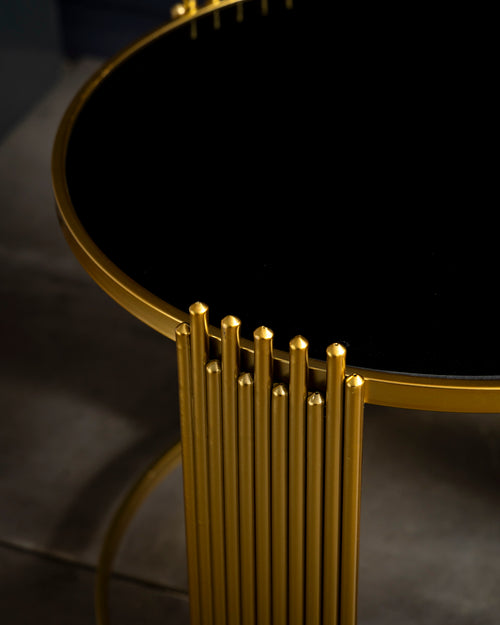 A bold statement of luxury and design, this center table features a sleek glass top encircled by a radiant gold-finished frame. The vertical pillar-style metal detailing adds a sculptural touch, creating a perfect balance of strength and elegance.