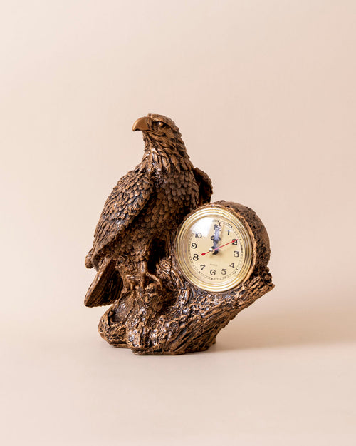 Elevate your décor with this striking majestic eagle table clock. Crafted with intricate detailing, the eagle perched on a tree stump symbolizes strength and resilience. The antique bronze finish adds a rustic charm, while the classic clock face complements the design. Ideal for offices, living rooms, or study spaces, this piece serves as both a functional timepiece and a statement of elegance.