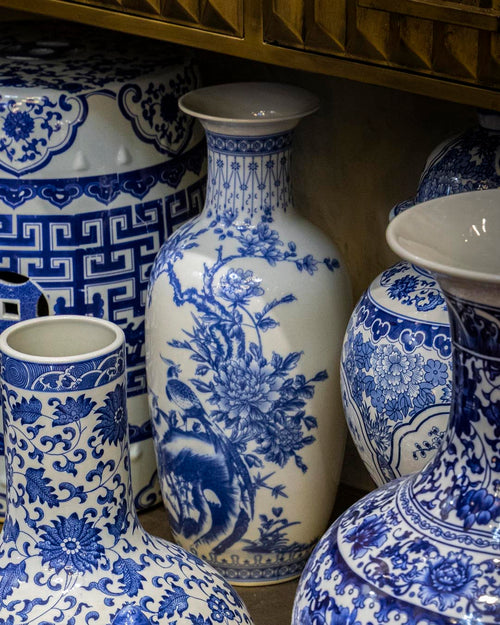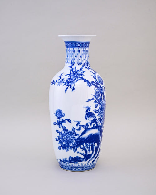 This exquisite Bone China vase features a majestic peacock surrounded by blooming flowers, symbolizing beauty, grace, and prosperity. The deep blue hand-painted detailing on a pure white base highlights traditional artistry with a modern, stylish appeal. Perfect for enhancing living rooms, hallways, or office décor, it looks stunning both with fresh arrangements or as a standalone showpiece. A timeless decorative treasure that adds luxury and charm to any space.