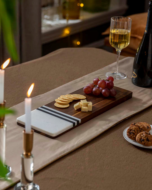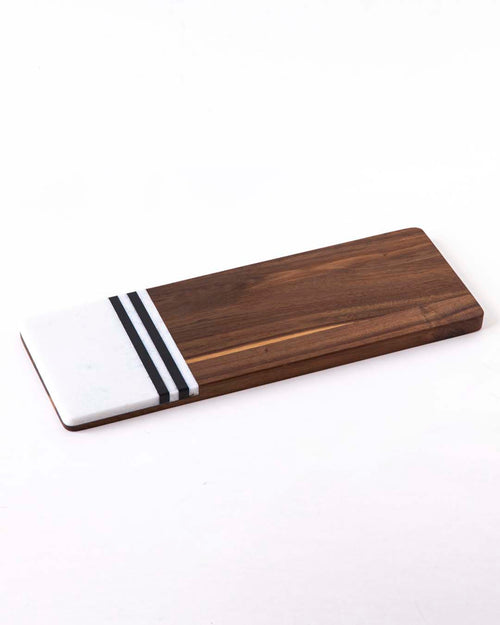 This long, rectangular serving tray blends the richness of walnut wood with a striking marble accent at one end. The marble section features elegant black and white stripes, creating a bold contrast against the warm wood grain. Ideal for serving charcuterie, bread, or appetizers, this tray is both functional and stylish.