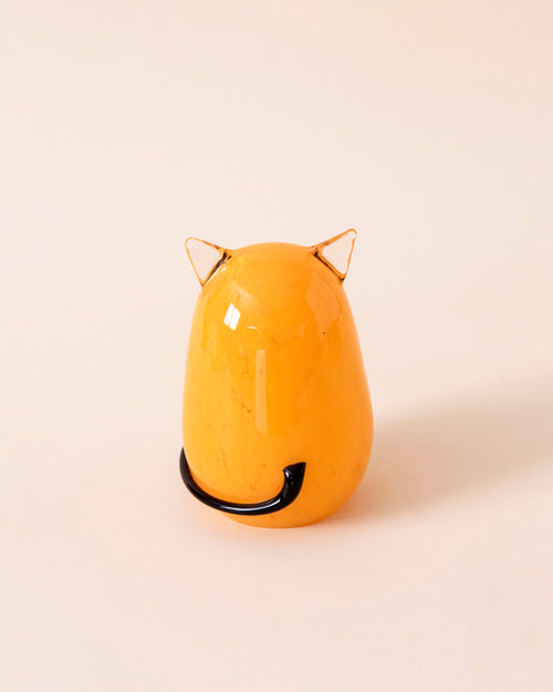This is a glass cat figurine with a minimalist and adorable design. The sculpture features a smooth, rounded body in a warm amber-orange hue, resembling a charming feline. Small black eyes, a button-like nose, and delicate white whiskers add a cute and expressive touch. The curled black tail and pointed ears complete its playful yet elegant look, making it a delightful decorative piece.