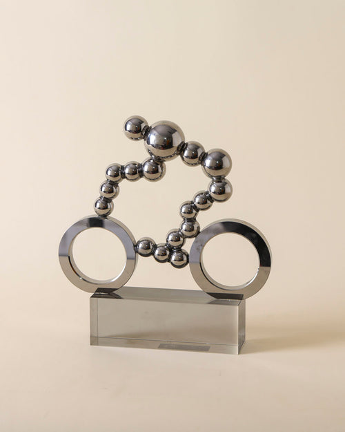 A sleek and modern tabletop decor piece featuring a minimalist bicycle design crafted with metallic spheres and circular shapes. The reflective silver finish adds a contemporary touch, making it a striking addition to living rooms, offices, or shelves. Perfect for cycling enthusiasts or those who appreciate unique artistic sculptures.