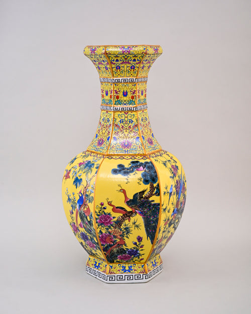 The Midnight Bird Motifs Cloisonné Vase is a stunning masterpiece of traditional craftsmanship, featuring a yellow enamel base adorned with intricate floral and exotic bird motifs. The hand-painted golden detailing adds a regal touch, making it a luxurious statement piece for any home décor.